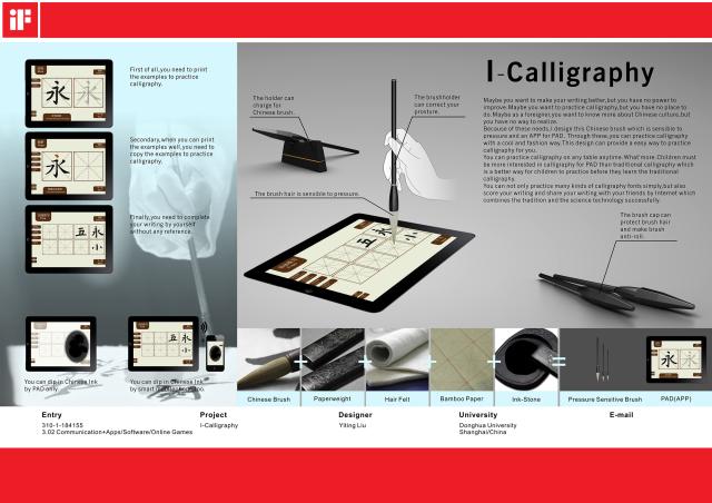 2016年4月7日全球工业设计权威奖项——德国IF设计奖评委会公布了2016年度概念奖的获奖名单。beat365官网工业设计系刘奕廷同学提交的“I Calligraphy”作品从11000多件参赛作品中脱颖而出,获得IF概念设计奖(iF STUDENT DESIGN AWARD 2016)。