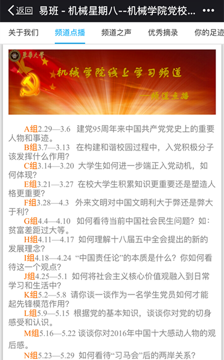 为了增强广大入党积极分子和发展对象的政治意识、大局意识、核心意识和看齐意识,促进“两学一做”落实,从而提升党性修养和思想觉悟,机械学院党校自20162月以来,在学院入党积极分子培训班和发展对象培训班中积极开展“易班”线上话题讨论交流活动,利用校园自媒体平台“易班”轻应用,开辟“机械星期八”线上学习频道,鼓励学员们踊跃发言讨论,加深对党的理论知识的认识和见解。