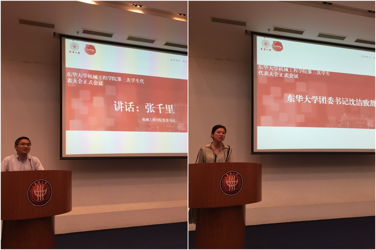 5月18日,机械学院第三次学生代表大会在松江校区图文信息中心第二报告厅举行。机械学院党委书记张千里、校团委书记沈洁、机械学院副院长唐智、机械学院党委副书记李宁蔚,兄弟学院团委书记代表、以及机械学院专兼职辅导员,机械学院全体学生代表、兄弟学院学生会代表与会。会议听取和审议机械学院学生会工作报告,机械学院研究生会工作报告,听取和审议学代会提案工作报告,选举产生机械学院第三届学生委员会委员和学生会新一届主席团。