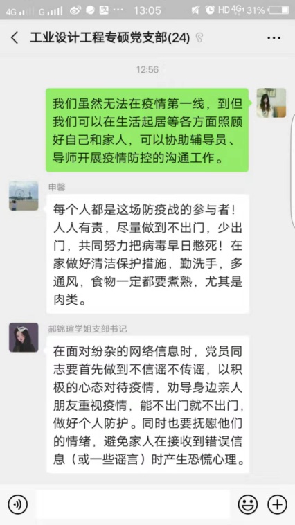 机械博士党支部史彬参与社区值班,协助居委会做好社区人员进出登记工作;机械183硕党支部刘建辉每天定期给电梯按钮消毒,以降低社区人员使用电梯出现感染的风险;工业设计专硕党支部陈晓燕轮岗值班量体温,她表示:“全心全意为人民服务一直都是一名党员应该牢记在心的初心使命,通过基层抗疫工作,我更加坚定了这一信念。尽管每天早晨5点多便起床上岗,但看着全国确诊病例不断下降,我越发觉得自己的辛苦是有价值的。”