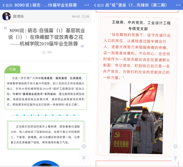 学院密切关注学生的思想和心理状态,加强疫情期间学生的网络思政教育和爱国主义教育。以易班网络思政平台为主阵地,面向师生等不同群体开设“我在学生战‘疫’线”、“战‘疫’堡垒”、“青春战‘疫’易起来”等专栏,通过辅导员的抗“疫”日记、空中系列主题班会、抗“疫”文艺作品等形式,讲好疫情防控中的中国故事,利用这一场没有硝烟的“全员战争”,借助社会这个“大课堂”、人民群众这位“好老师”,上好一堂生动而难忘的爱国主义“思政大课”。