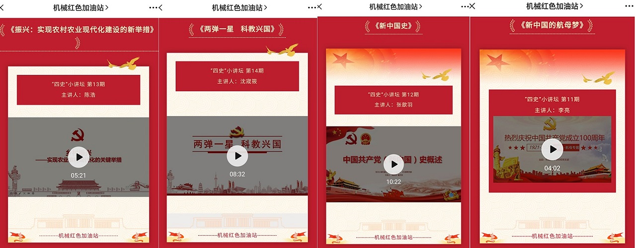 学生领读明史有声。充分发挥学生党员在理论素养、党性修养方面的“头雁”作用和“领航”功能,深入推进“党员思想家”计划,在机械红色加油站平台打造“四史小讲坛”朋辈宣讲云微栏,引导学生党员聚焦党史、中国精神、中国制度等主题录制微视频,已录制《两弹一星 科教兴国》《乡村振兴》《新中国的航母梦》等40余期微视频;聚焦《共产党员应知的党史小故事》党史书籍录制有声读物,已录制《李四光:把入党作为生命新起点》《邓颖超的两份遗嘱》《任弼时:时刻把群众利益放在心上》《彭德怀的“四个不准”》等30余期微音频,鼓励学生党员全员“开讲”,用理想和信仰之光凝聚群众。