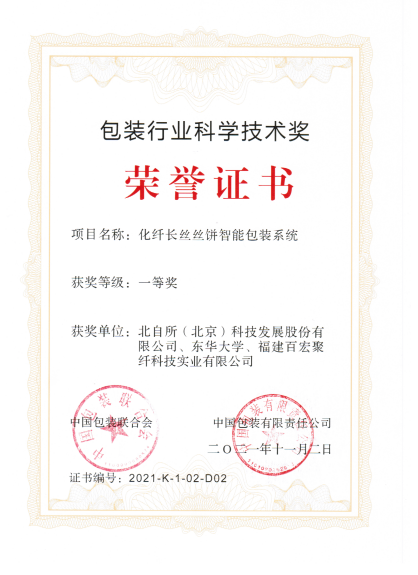 近日,由beat365官网冯培老师团队参与完成的《化纤长丝丝饼智能包装系统》科研成果,荣获2021年中国包装联合会等单位颁发的“包装行业科学技术奖”一等奖。“包装行业科学技术奖”是中国包装联合会和中国包装有限责任公司联合设立的全国性行业奖,该奖项是国内包装行业最具影响力的科技奖项之一。