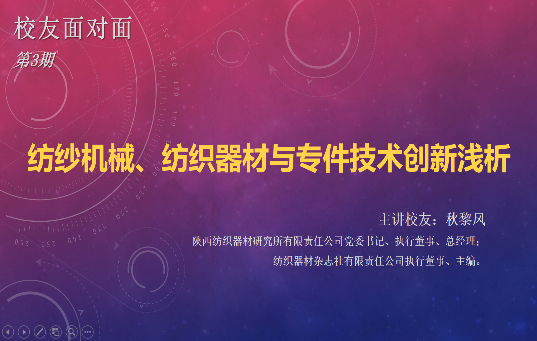 报告中,秋黎凤校友首先对陕西纺织器材研究所、《纺织器材》期刊做了简要介绍,围绕纺织装备技术优先发展方向、全国纺织机械技术标准体系做了全面梳理讲解,重点讲述了多供-缓存式梳并联机组、棉纺(超)大牵伸工艺、环锭纺自动接头机、环锭细纱机纺纱纱条在线自动监测等四项行业重点发展技术,最后结合纺织器材与专件未来发展做了展望。讲座后,与会师生与秋校友进行了热烈的互动交流与探讨。本次讲座内容进一步加深了青年教师们对纺织机械行业未来重点发展内容的理解。