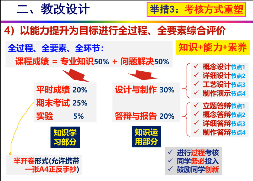 郭为忠教授从教改背景、教改设计、教改实践三方面,详实地介绍了基础课《设计与制造II》的教学改革实施过程;分享了融入课程、融入科创指导的科教融合教改经验,从产品单元和系统视角重构课程知识体系,形成层次化的知识点和能力点清单。分享了“马拉松模式+双主线模型+微科研训练技法”的项目式教学方法,以及“全过程、全要素”的综合评价方式。