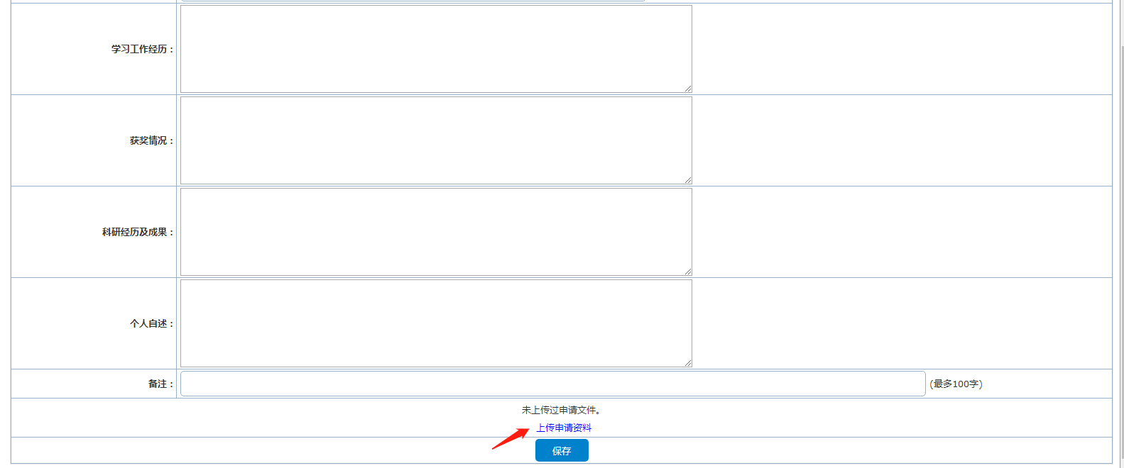 四、填写相关正确信息后,在最下方点击上传申请材料(或按学院要求发送申请材料到指定邮箱、网盘等)。