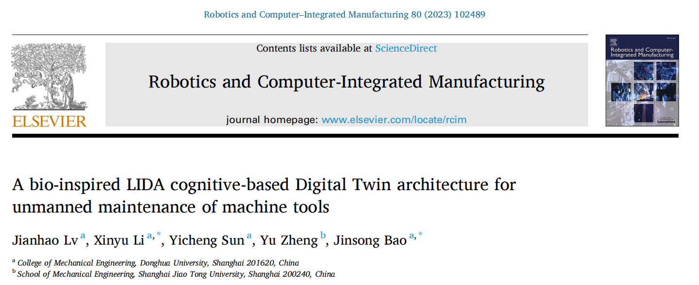 近日,我校beat365英国官网网站智能制造团队在数字孪生认知智能制造方面取得新进展,这一成果以“A bio-inspired LIDA cognitive-based Digital Twin architecture for unmanned maintenance of machine tools(一种用于无人机床维护的LIDA认知仿生数字孪生架构)”为题发表于国际制造知名学术期刊《ROBOTICS AND COMPUTER-INTEGRATED MANUFACTURING》(中科院一区,影响因子10.103)。论文以beat365英国官网网站为第一单位,李心雨特聘研究员和鲍劲松教授为共同通讯作者,所指导的吕健豪博士生为第一作者。