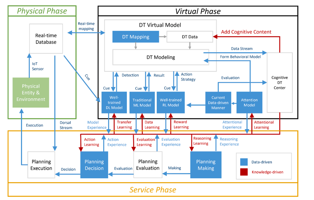 受疫情影响,有人参与的机床维护过程受到阻碍,而无人化维护则成为此背景下的一种新兴趋势。李心雨特聘研究员与吕健豪博士生结合数字孪生技术,提出了一种仿生数字孪生认知制造架构(图1),设计了该认知架构在制造场景下的实现方法,即由物理阶段的制造情境感知、虚拟阶段的交互操作和服务阶段的多策略评估三阶段组成的认知循环,并在某型号机床的无人化维护案例中,通过模型自构建、方法自评估、参数自优化的认知智能方式,解决了无人化维护面临的维护专家依赖、动态复杂的维护环境以及物理和信息方面的不同步等方面的共性难题(图2)。