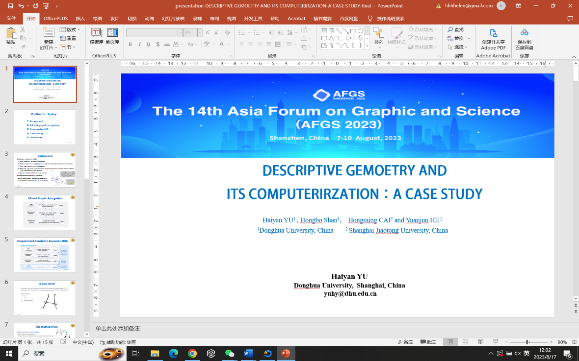 8月7日到10日,“第十四届亚太图学论坛(AFGS 2023)”于在深圳召开。本次论坛由中国图学学会、北京理工大学主办,日本图学会和国际几何与图学会(ISGG)协办。中国图学会理事长赵罡、日本图学会理事长Hirotaka Suzuki、国际几何与图学学会主席Luigi Cocchiarella分别致欢迎辞。beat365官网于海燕副教授在会议论坛上作了题为《Descriptive Geometry and its computerization: A case study》专题报告,向国际学者介绍了团队提出的画法几何计算化及形计算理论,展示了我校在画法几何学、图形思维以及几何计算等方面的交叉研究成果,引起与会学者专家的广泛关注。