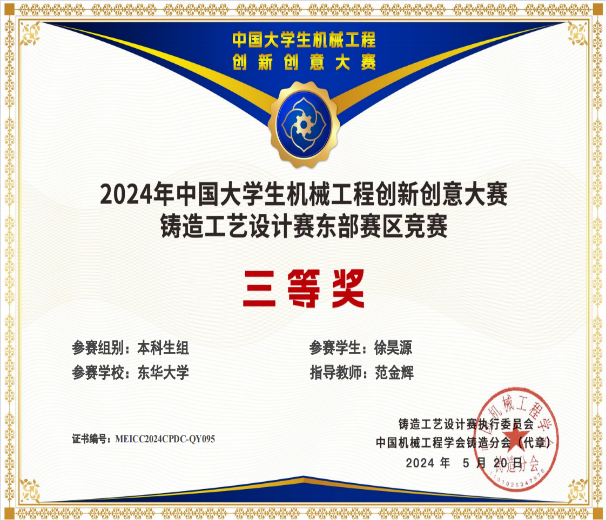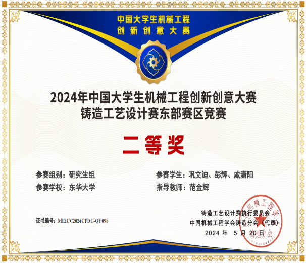 本次赛事共有132所参赛院校的1715份作品报名参赛,经校内选拔赛,最终819份作品提交至执委会参加区域赛,其中本科生组作品715份,硕士研究生组作品104份。铸造工艺设计赛全国总决赛初评评选会议于2024年5月30日在辽宁省沈阳市召开,会议期间产生了本届赛事的三等奖(部分)及入围全国总决赛终评的作品名单。我校研究生组的巩文迪、彭辉和戚潇阳同学获得了全国三等奖的好成绩,并且本科生组的骆怡彤和蒙娅同学与研究生组的尚坡、王鹭和程健森同学都进入到了决赛。后续铸造工艺设计赛总决赛终评会议将在7月8日前后举行,将与全国优秀院校角逐名次。