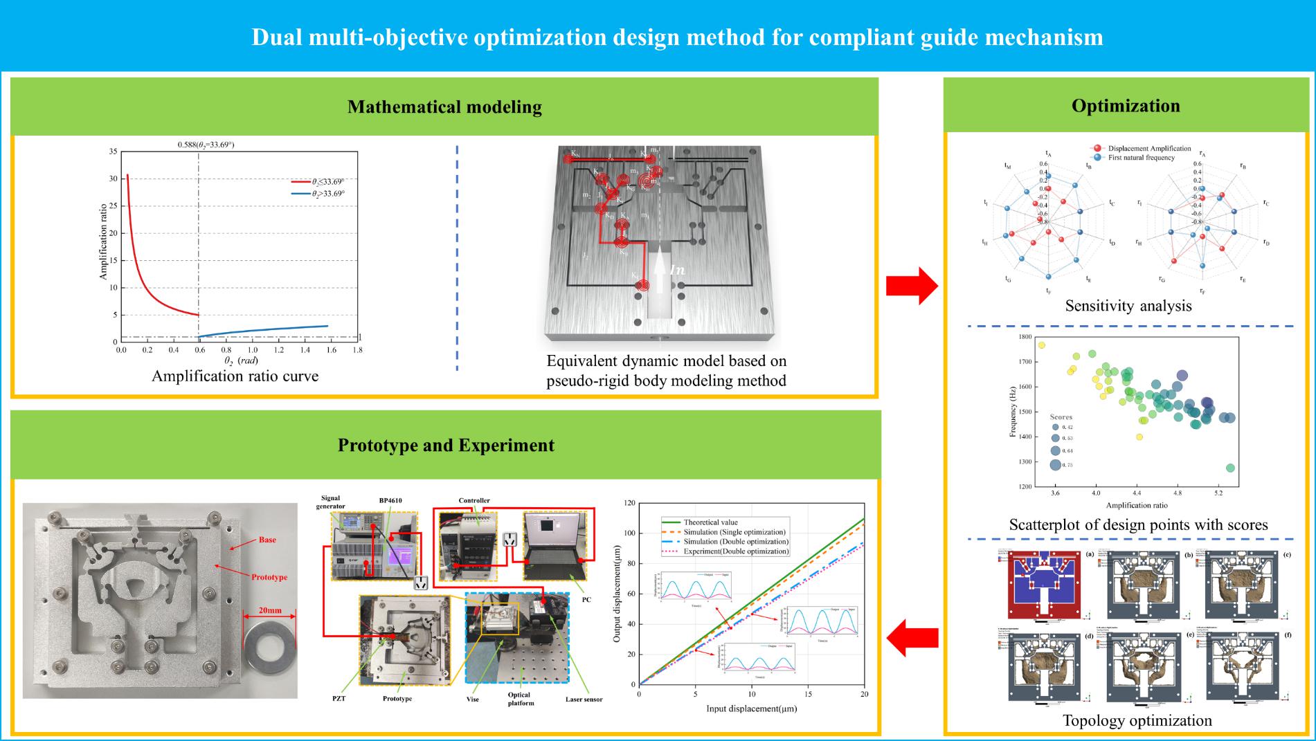 柔顺机构具有精度高、重量轻、易加工、无摩擦、无需润滑等特点,通过弹性构件的挠曲变形实现微纳米位移的精准传递,在超精密作业中扮演重要角色,目前已在精密光学、细胞操纵、可控核聚变、太空探测等高精尖领域得到应用。课题组团队通过构建柔顺机构优化设计新方法,提出了双重多目标优化设计流程,并以“Dual multi-objective optimization design method for compliant guide mechanism”为题发表于国际期刊Structural and Multidisciplinary Optimization(IF: 3.9, JCR Q1),beat365英国官网网站为唯一通讯作者单位,孙志宏教授为该论文的第一作者,孙小庆副教授为通讯作者。文章链接:https://doi.org/10.1007/s00158-024-03793-z