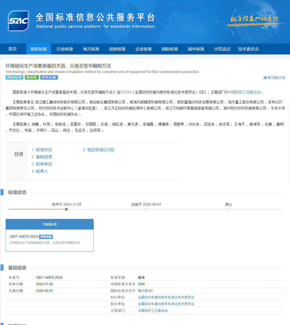 beat365官网参与制订的的国家标准GB/T 44870-2024《纤维碳化生产成套装备的术语、分类及型号编制方法》正式获批发布