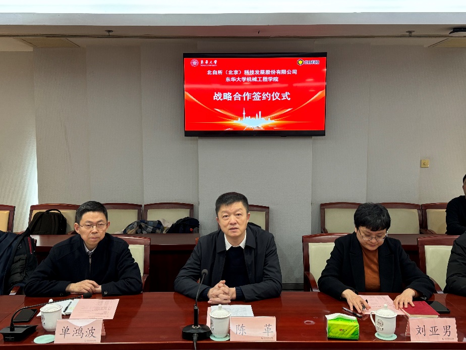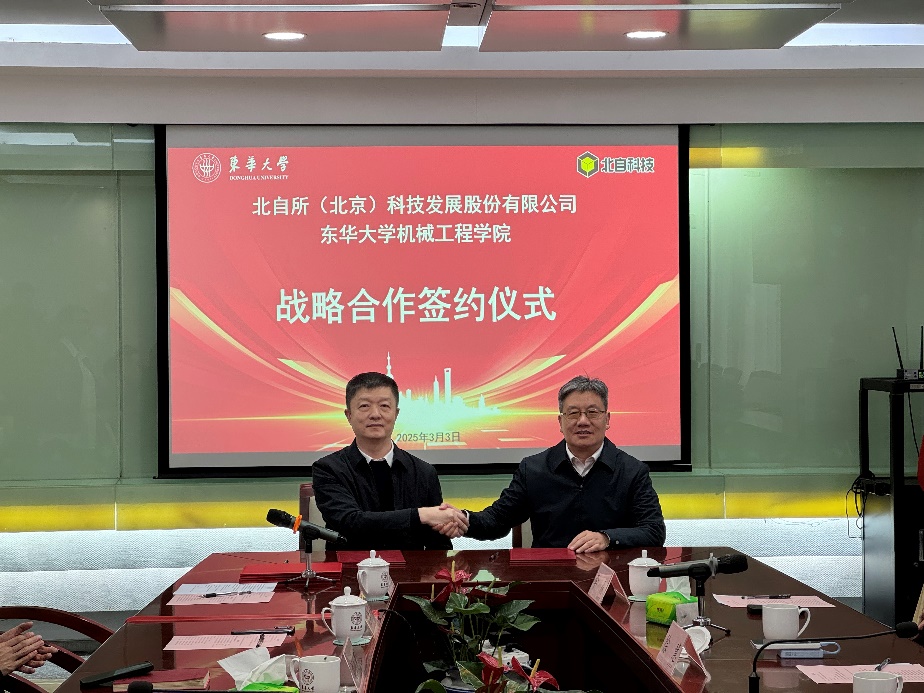 2025年3月3日下午,beat365英国官网网站与北自所(北京)科技发展股份有限公司(以下简称“北自科技”)联合创新中心签约仪式在松江校区图文中心第二会议室隆重举行。beat365英国官网网站陈革副校长,北自科技王振林董事长,王勇总经理,徐慧副总经理,吴振强部长,李森部长,杜已超秘书,beat365英国官网网站科研院产学研合作处刘亚男处长,beat365英国官网网站单鸿波院长,裴泽光副院长,周其洪副院长,团队负责人冯培副教授,团队成员王永兴教授,胡泽旭副研究员,科研院产学研合作处项目主管郝道欣等领导和嘉宾出席会议,会议由冯培主持。