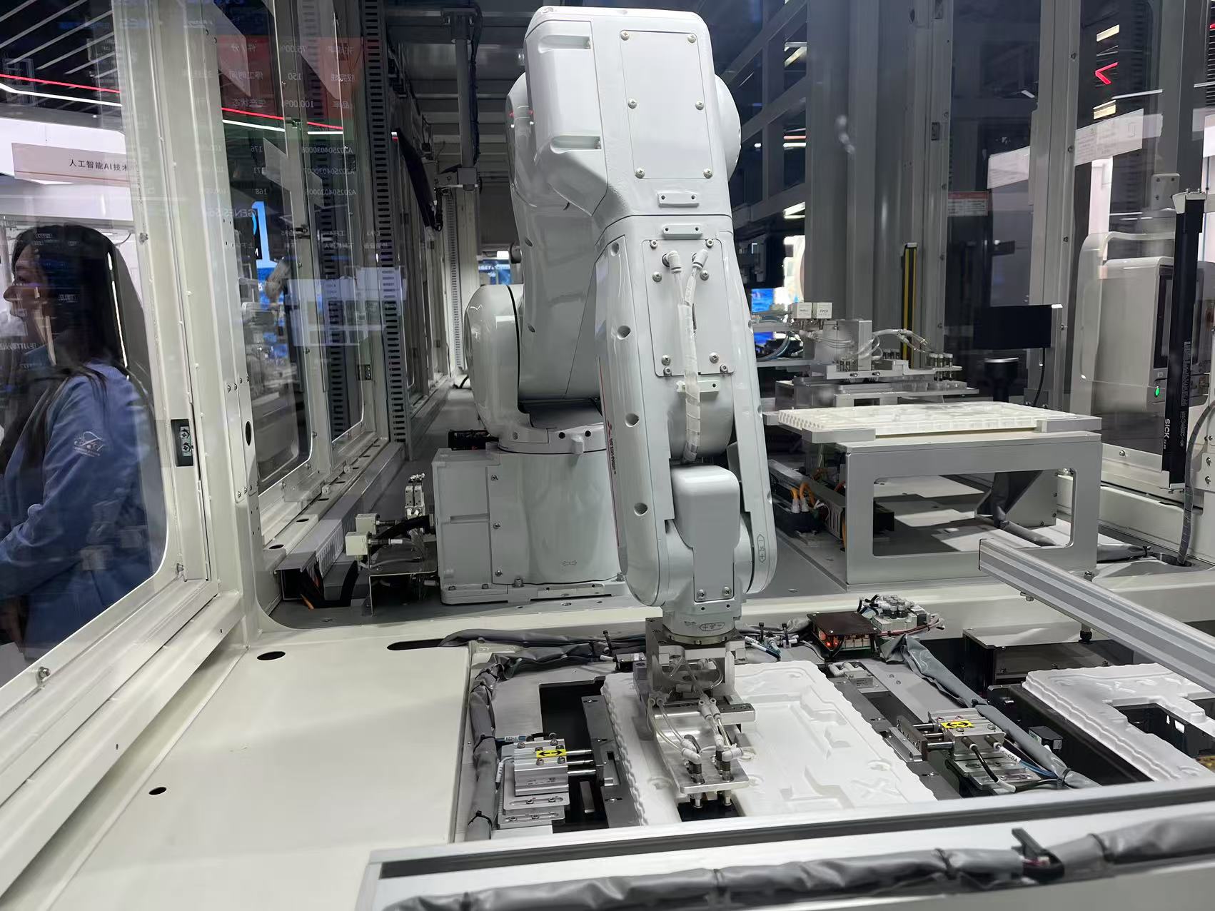 在三菱电机技术专家的引导下,师生团队系统参观了技术展区。AI 与数字化制造展区团队深度体验三菱电机自主研发的 MELSEC MX 控制器。该控制器采用多核处理器架构,集成运动控制、视觉检测和边缘计算功能,可实现 128 轴同步控制,响应速度达 1.2ms。学生现场操作其数字孪生系统,通过虚拟调试优化产线布局,直观感受 "数字主线" 技术对生产效率提升的革命性作用。