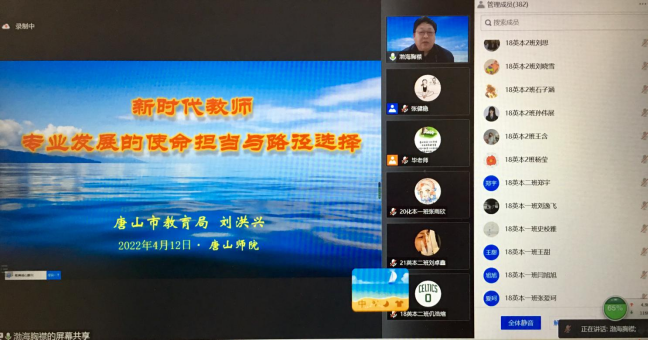 为引导全体公费师范生树立职业理想信念,争做“四有”好老师,Beat365官方网站承办了Beat365官方网站第七期公费师范生“名师讲堂”活动。4月12日下午,特邀唐山市教育局三级调研员刘洪兴教授做客空中“名师讲堂”,在腾讯会议开讲。讲座以《新时代教师专业发展的使命担当与路径选择》为主题,由Beat365官方网站副院长张健稳主持。