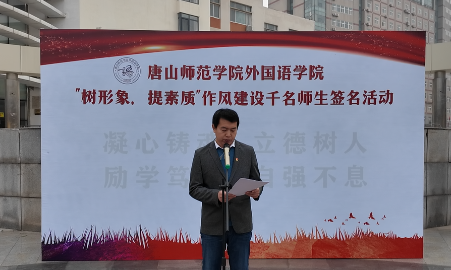 会上,谷书记宣讲了学校文件,介绍本次活动的主旨,教师要“凝心铸魂、立德树人”,学生要“励学笃行、自强不息”。李景峰老师代表全体教师作表态发言,他从外院建设、教师发展、价值追求三个方面出发,强调作风建设的重要性,号召师生共同参与,营造风清气正的外院教育教学环境,王紫诺同学代表全体学生作表态发言:作为新时代的青年大学生,要保持健康向上的作风,积极担当作为,勇做新时代的弄潮儿。