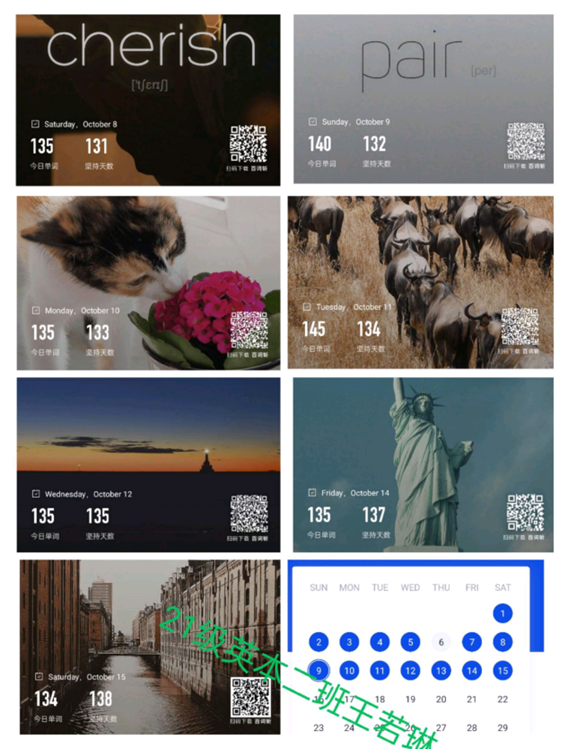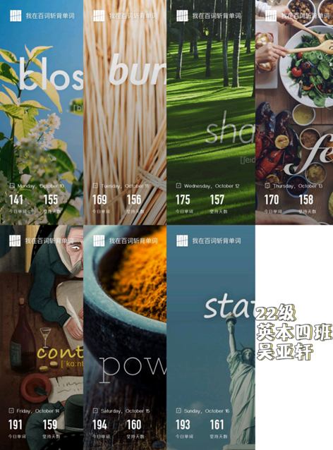 为调动了学生们的学习热情,培养良好的每日单词打卡习惯提供契机,同时增进同学们学习上的交流,形成了良好的学习氛围,Beat365官方网站于2022年10月8日举行了“七天单词打卡”活动。