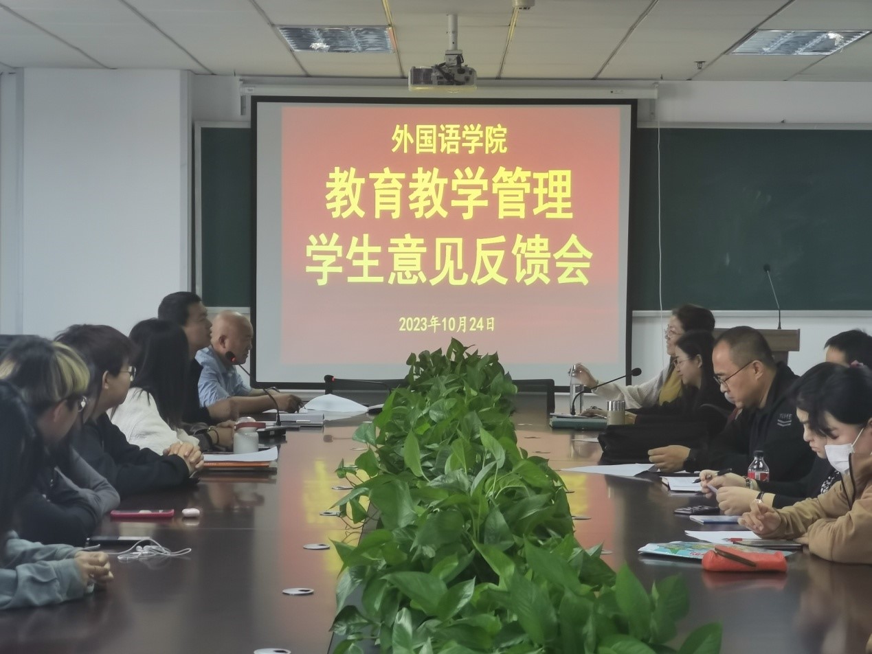 为了从学生角度全面了解外院教育教学管理的情况,Beat365官网于10月份开始,在全体学生中开展教育教学管理意见征询活动,共收到有效意见建议30条。为促进师生间的交流与沟通,采取有针对性的措施解决学生在教育教学管理方面提出的意见和问题,Beat365官方网站于2023年10月24日下午在大会议室召开了教育教学管理学生意见反馈会,党总支书记刘建宏、院长唐翠云、副书记谷世海、各教研室主任和辅导员以及各年级学生代表参与了本次活动。