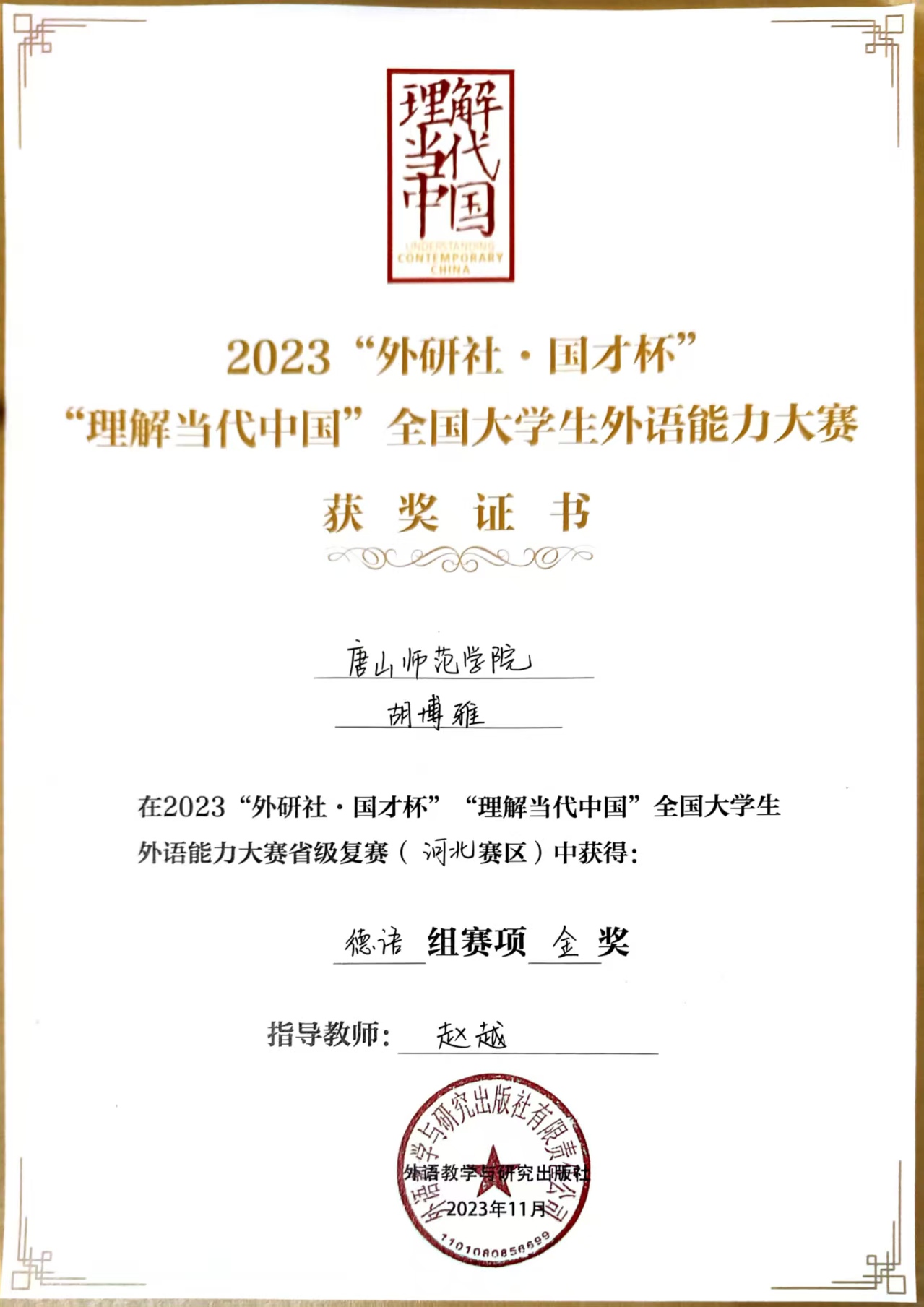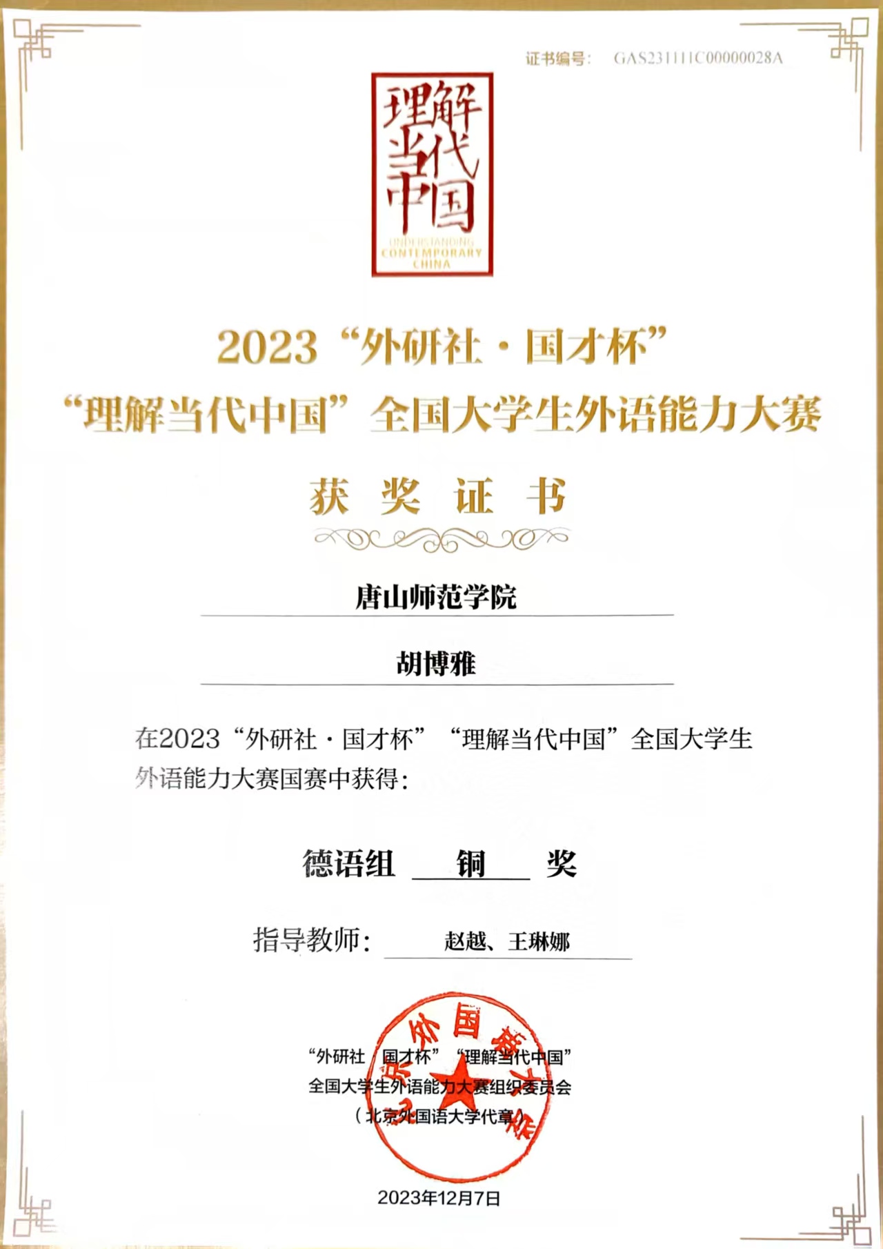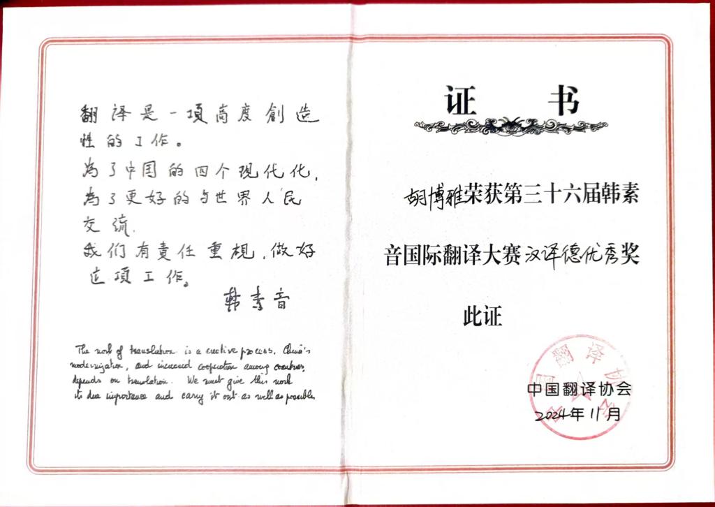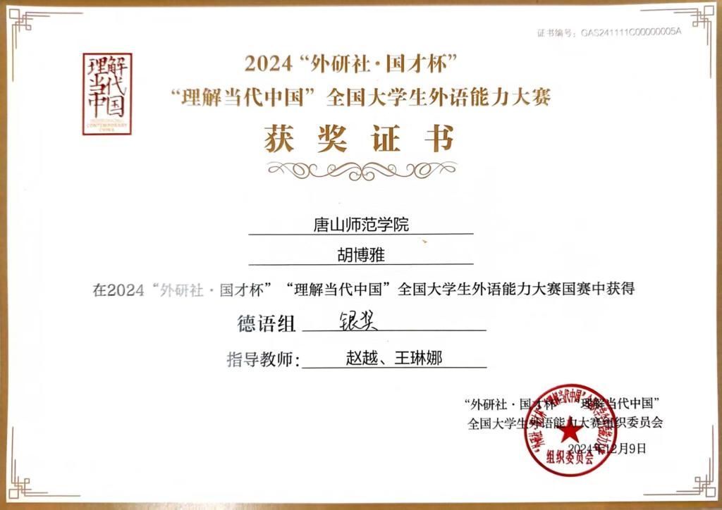 作为德语专业学子,胡博雅同学始终坚持将学术积淀与语言实践深度融合。2024年,报名参加“理解当代中国·全国大学生外语能力大赛”,在指导老师的悉心帮助下,历经校赛、赛、国赛的层层角逐,最终斩获德语组全国银奖。备赛期间,以《习近平谈治国理政》德语版为学习蓝本,通过高频次的阅读、翻译及演讲训练,实现语言能力的全面提升。赛场上,紧扣“理解中国,沟通世界”主题,巧妙结合德语表达特色与当代中国国际视野,出色完成即兴演讲和口译任务,充分展现了外语专业学生的学术素养与文化传播实力。这段经历让胡博雅同学深刻感悟到,外语学习者不仅需要夯实语言根基,更要锤炼跨文化传播能力,以专业之姿讲好中国故事。这份荣誉也将持续激励在专业领域深耕不辍,为中外文化交流注入青春力量。