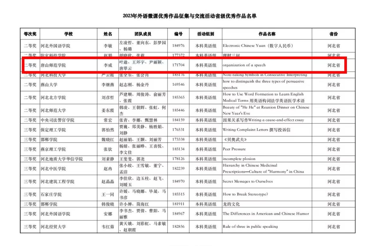 外语微课优秀作品评选与交流活动由全国高校教师网络培训中心与《中国外语》编辑部、高等教育出版社共同组织。我校李威教师团队作品“Organization of a speech”,使学生们理解掌握组织演讲主体部分的基本方法,并能够在演讲当中将其有效运用,增强演讲效果。做到了以学生为中心,突出语言的实际应用,是我校外语教学成果的典型代表。